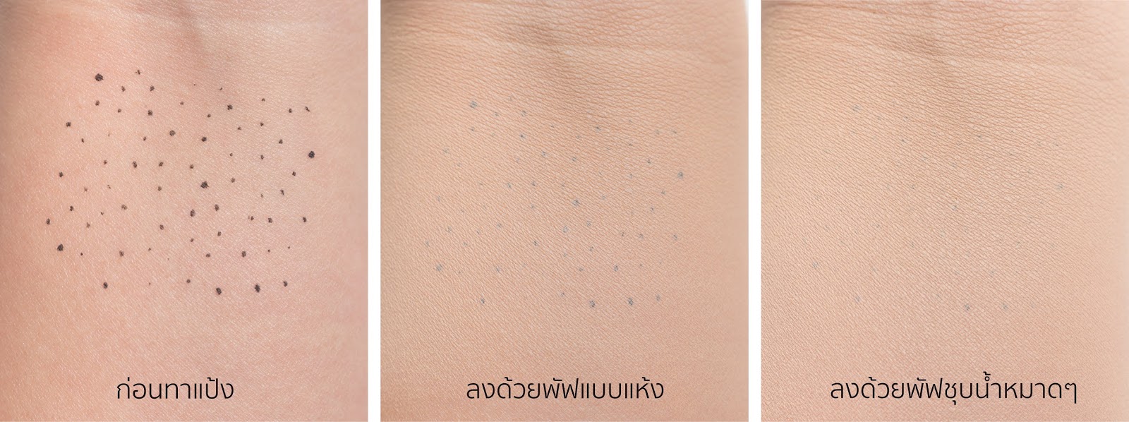 เปรียบเทียบวิธีการลงด้วยพัฟทั้งแบบแห้งกับลงแป้งด้วยพัฟชุบน้ำหมาดๆ จะเห็นได้ชัดเลย