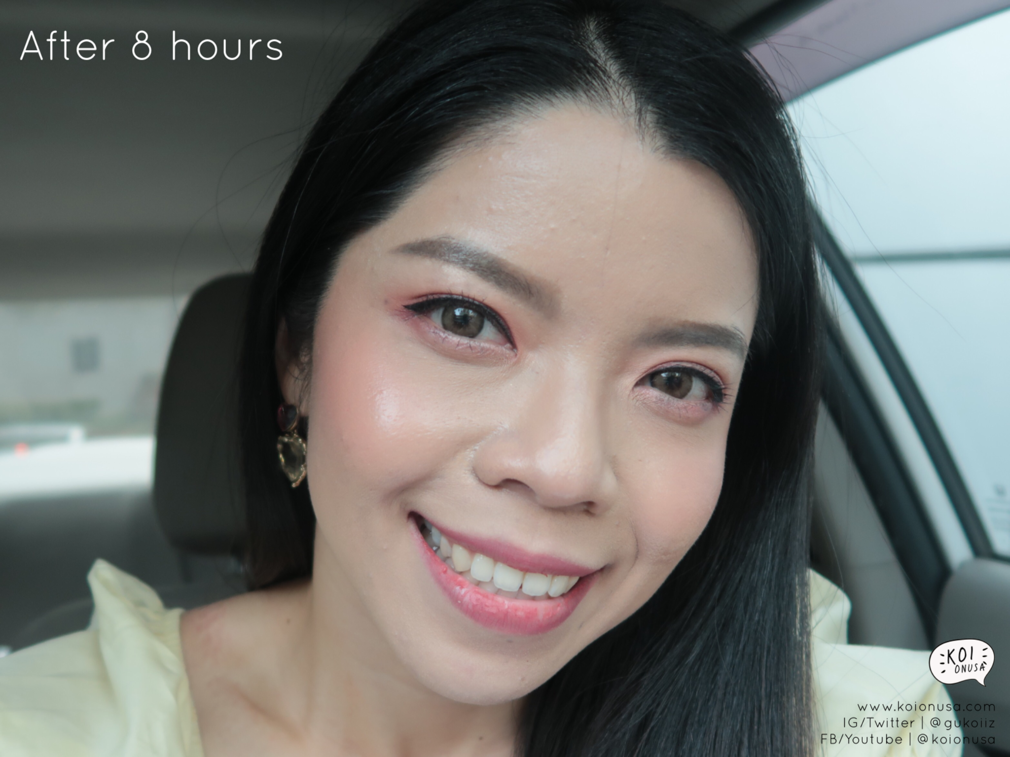 ผ่านไป 8 ชั่วโมง หน้าของก้อยจะวาวขึ้น แต่หน้าไม่มันเมือกนะ ผิวมันดู Glow ขึ้น และแป้งหรือเครื่องสำอางบนผิวไม่ไหลมาเป็นคราบ ไม่มีคราบเค้กเลย เราประทับใจ CC Cream โดยใช้คู่กับแป้งของเค้ามากๆ เลย