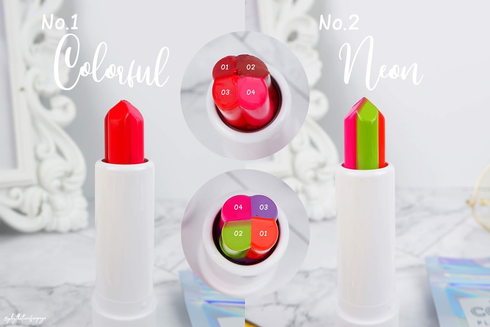 ลิป 4 แยก No.2 Neon สวยเก๋เว่อร์ สาวมั่นสายแฟชั่นต้องปลื้ม สายปาร์ตี้ต้องมีจริงๆ เป็นสีที่ทายังไงก็รอดและโดดเด่นมาก แค่เห็นก็สะดุดตามากจ้า ใครทาเดี่ยวๆแล้วกลัวไม่ปัง จับมาผสมสีกันก็ได้นะ ได้หลากหลายเฉดสีไม่แพ้ ลิป 4 แยก No.1 Colorful เลยเน้อ