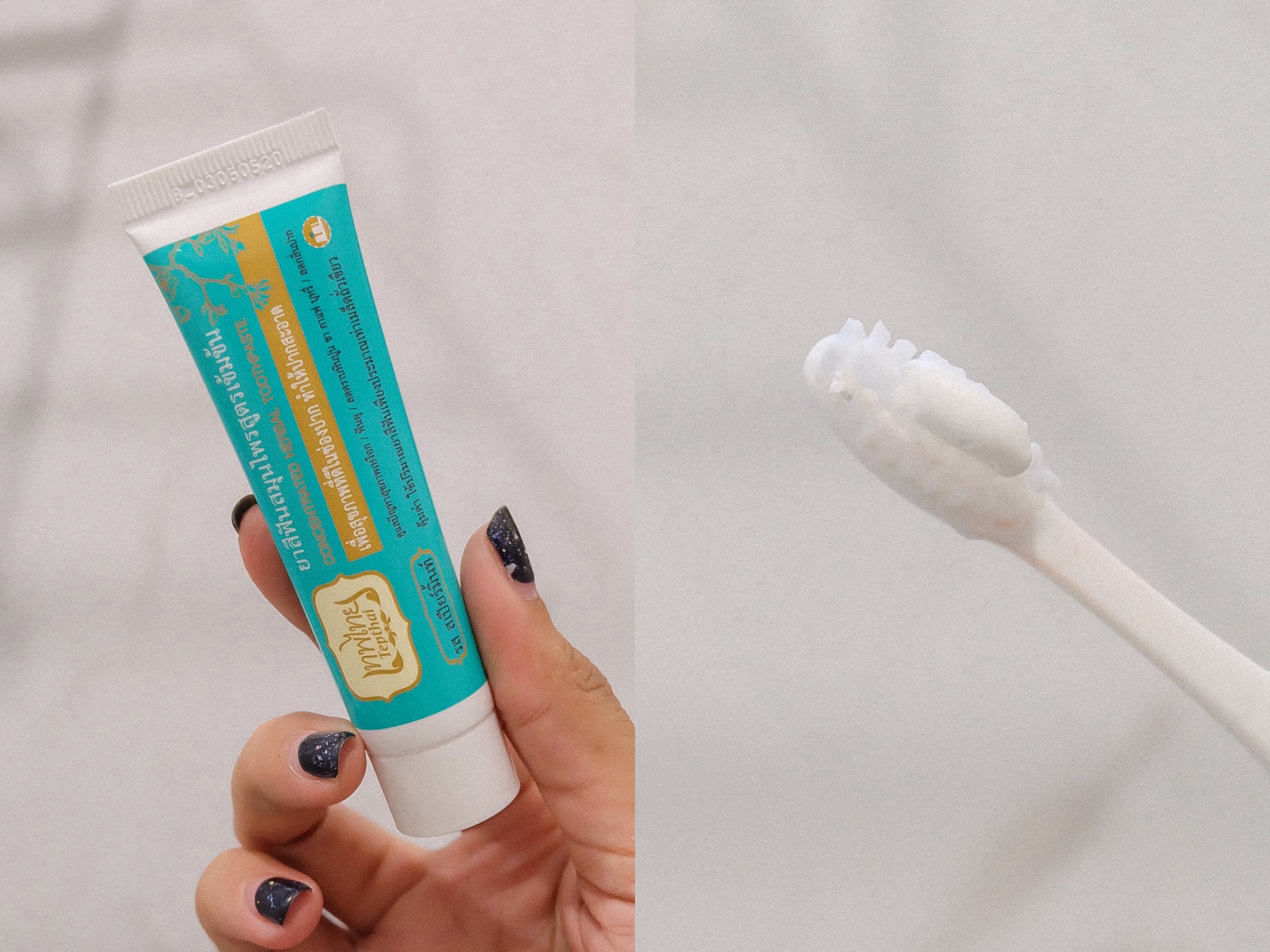 ยาสีฟัน Tepthai รสสเปียร์มิ้นท์ ตัวนี้ผลิตจากสมุนไพรธรรมชาติหลายชนิด ช่วยดูแลสุขภาพเหงือก ลดกลิ่นปาก และลดคราบหินปูน ชา กาแฟ บุหรี่ต่างๆ แพ็คเกจมาในหลอดเล็ก ฝาหมุน เนื้อยาสีฟันเป็นสีขาว ใช้ปริมาณนิดเดียวก็ได้แล้ว ส่วนตัวคิดว่ากลิ่นหอมสดชื่นดี แต่มีกลิ่นการบูรและสมุนไพรออกชัดมาก ไอซ์ว่ากลิ่นมันตีกัน แล้วแต่คนชอบ ความสะอาดรู้สึกฟันสะอาดดี