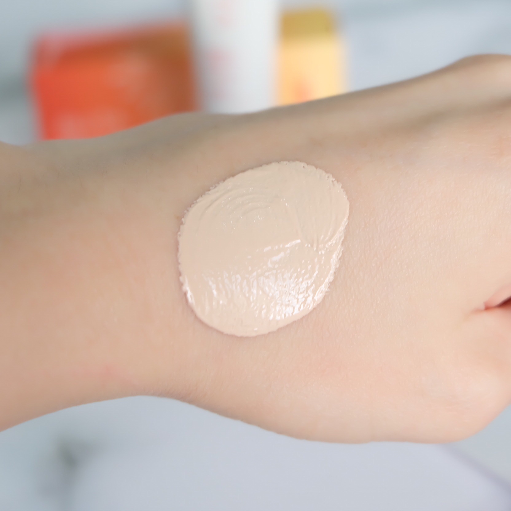 เนื้อครีมสีเนื้อ เกลี่ยง่าย บางเบา ไม่เหนียวเหนอะหนะ
