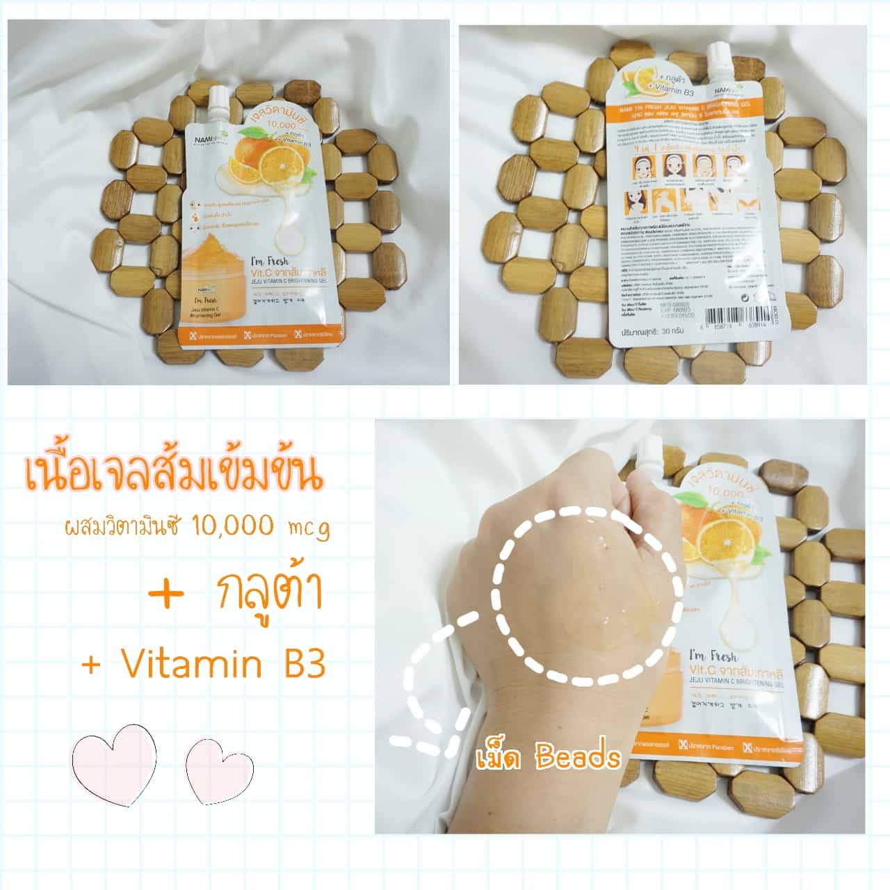 - นามิเจลส้ม ชอบที่เอาไปแช่ตู้เย็นแล้วมาทาสดชื่นดี มีเม็ด BEADS ด้วย ซึมไวหอมกลิ่นส้ม