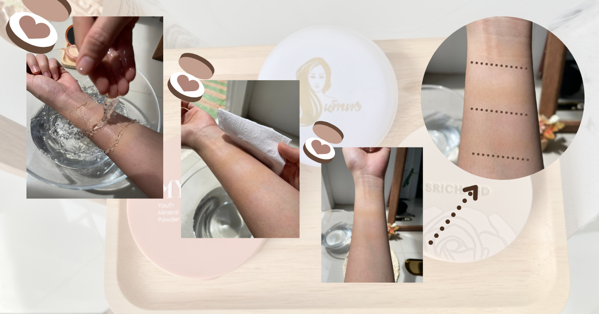 เริ่มทดสอบกันเลย! หลังจากที่ลงแป้งที่เเขนแล้วก็ละเลงน้ำเทลงไปเน้นๆ ตรงที่เราลงแป้งเลยค่ะ ทิ้งไว้สักพักหน่อยๆ ก็ซับๆ น้ำออก
