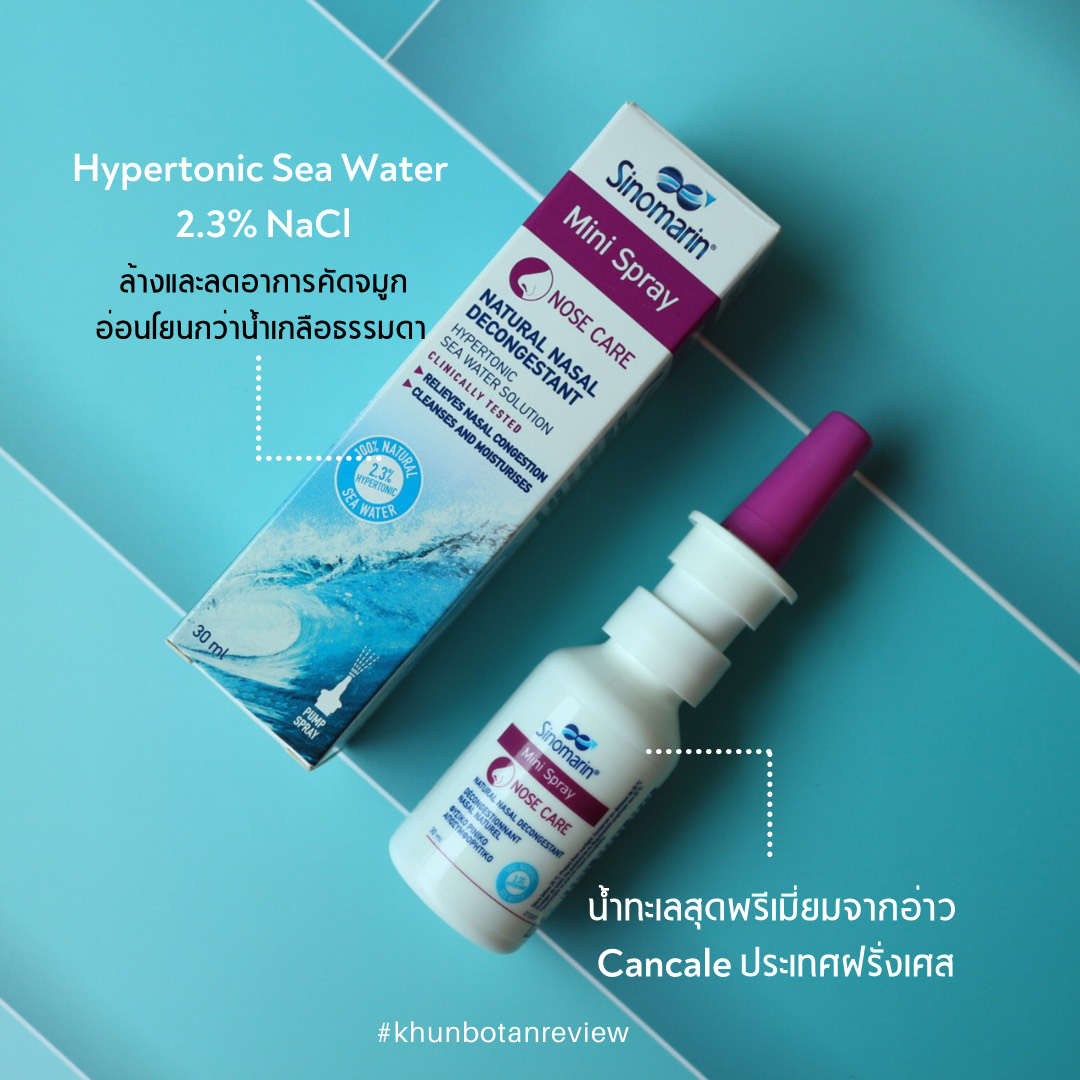 ซึ่งโบตั๋นจะบอกคุณหมอทุกครั้งว่า...ลูกล้างจมูกยากมาก คุณหมอจึงแนะนำว่า...เดียวนี้เค้ามีสเปรย์พ่นจมูกสำหรับเด็กเล็ก แต่มีตัวเลือกให้ไม่มาก ต้องดูส่วนผสมที่มาจากธรรมชาติ ด้วยความเป็นแม่ โบตั๋นจึงตามอ่านรีวิว ถามเพื่อนๆ คุณแม่บ้าง..อ่านคุณสมบัติบ้าง...ศึกษาผลข้างเคียงของการใช้สเปรย์พ่นจมูกเยอะมาก จนมาเจอ Sinomarin สเปรย์น้ำทะเลขวดนี้ และด้วยความที่อยากทดลองก่อนให้ลูกใช้...ก็เลยซื้อแบบของผู้ใหญ่มาใช้กับตัวเองก่อน….เพราะตัวโบตั๋นเองก็เป็นภูมิแพ้อยู่แล้ว และเมื่อให้น้องลองใช้ตอนเป็นหวัด ปรากฎว่าน้องไม่งอแง หายใจโล่ง หลับยาวจนถึงเช้า อาการหวัด คัดจมูกก็ค่อยๆ ดีขึ้นตามลำดับด้วย