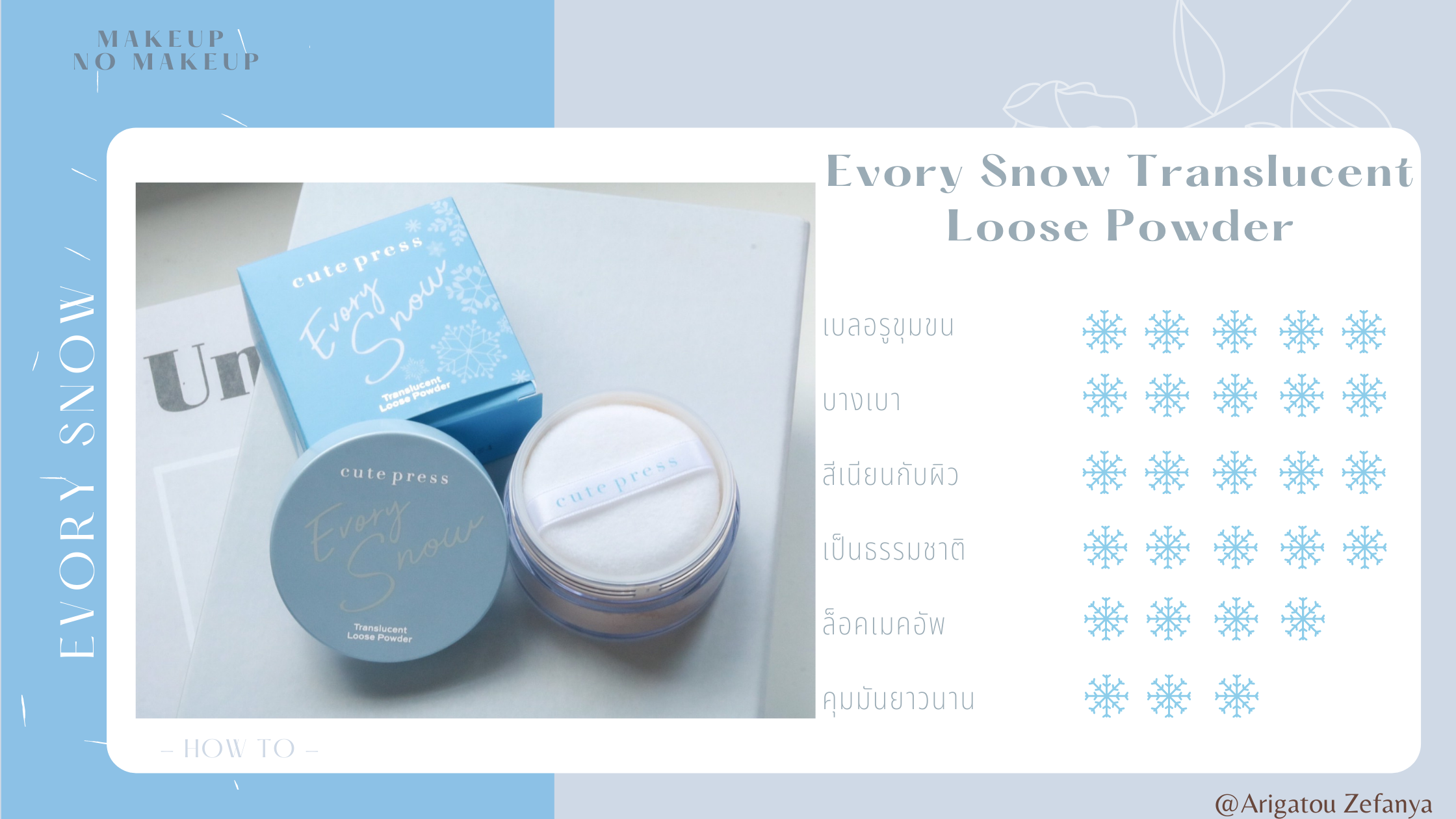 ลงรองพื้นเสร็จแล้ว ก็ไม่พลาดที่จะเซ็ทรองพื้นด้วยแป้งฝุ่น Evory Snow Translucent Loose Powder จากแบรนด์ Cute Press เช่นกันค่ะ ตัวนี้เป็นแป้งฝุ่นเนื้อโกลว์ บางเบามากๆ เหมาะกับสภาพอากาศบ้านเราเช่นกันจ้าาาา น้องเค้าให้งานผิวเปล่งประกายออร่าพุ่งเป็นธรรมชาติจาก Invisible Snowflex ด้วยน้า มิติใหม่ไปอีก ในตลับเค้ามีพัฟมาให้แล้วพร้อมใช้เลย
