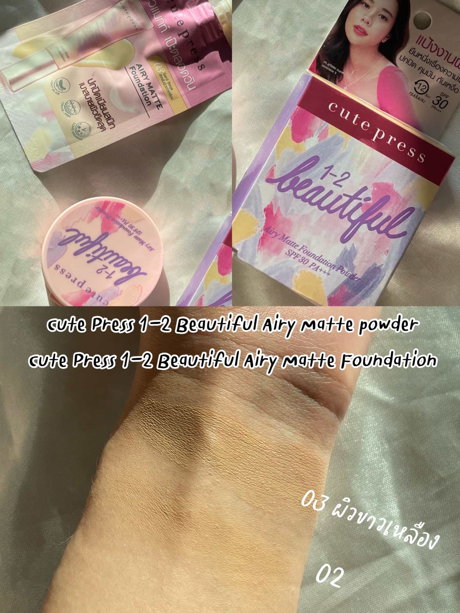 ตัวที่ 2 Cute Press 1-2 Beautiful Airy Matte powder และ Cute Press 1-2 Beautiful Airy Matte Foundation เป็นรองพื้นเนื้อสัมผัสเบาสบาย ให้การปกปิดที่เรียบเนียน เกลี่ยง่าย ไม่เป็นคราบระหว่างวัน ตัวนี้กันน้ำกันเหงื่อได้ด้วยนะ สามารถควบคุมความมันได้ถึง 8 ชั่วโมงเลย ใช้คู่กับแป้งมี SPF30 PA ช่วยเบลอรูขุมขน ช่วยดูดซับความมันได้ สีไม่ดรอประหว่างวัน พร้อมสารบำรุงจากวิตามินซีช่วยให้ผิวดูกระจ่างใส