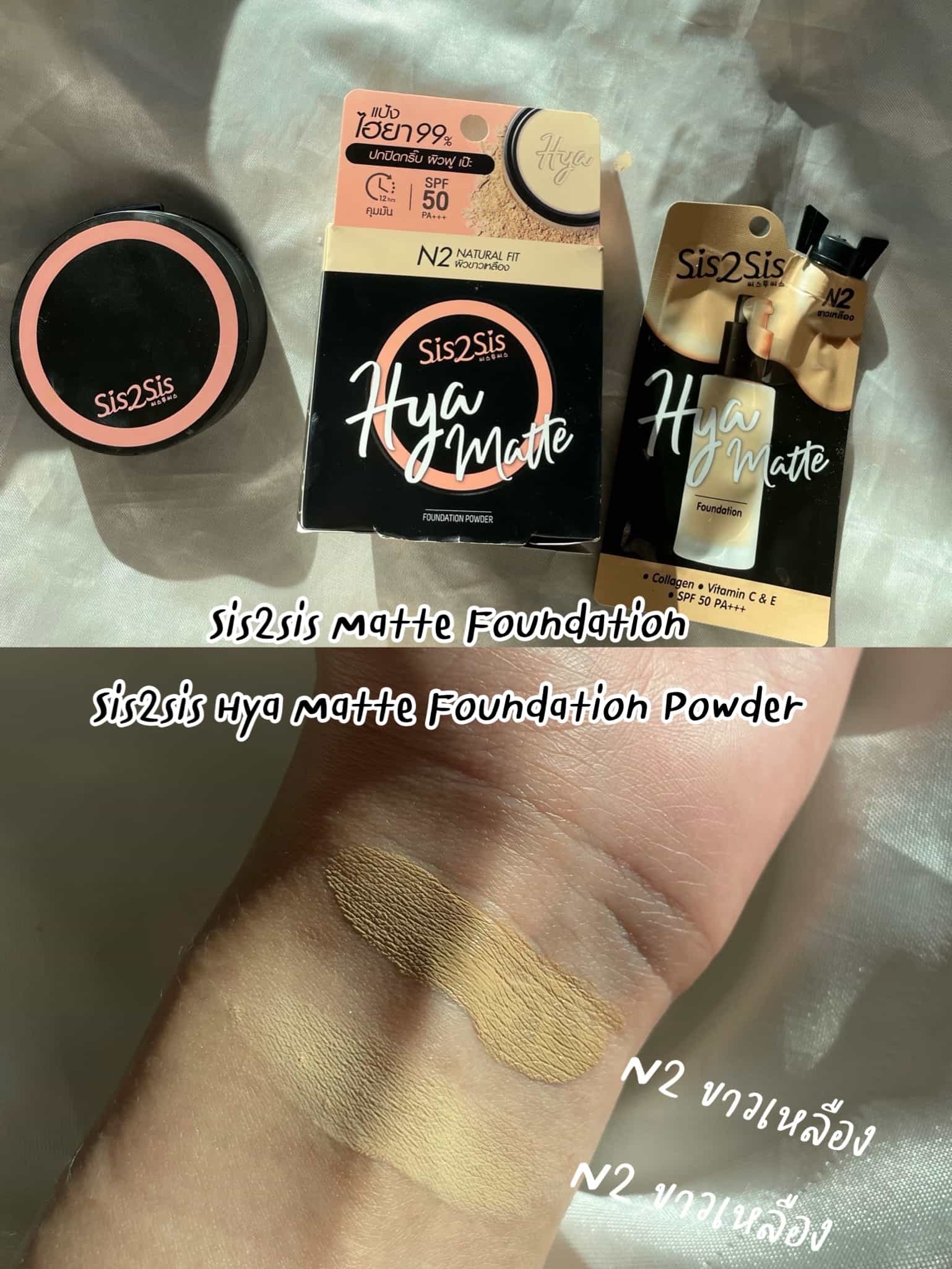 มาเริ่มที่ตัวแรกกันเลย sis2sis Hya Matte foundation และ sis2sis Hya Matte foundation powder เป็นรองพื้นแบบซอง มีเนื้อที่เกลี่ยง่าย มีส่วนผสมของไฮยา และยังมีคอลลาเจน วิตามินซี ละ อี แถมด้วย SPF50 PA การปกปิดปานกลาง สามารถทาปกปิดเฉพาะจุดได้ ให้งานผิวแบบแมตต์ที่ไม่ดูแห้ง เป็นงานผิวให้ความธรรมชาติ ผิวสวยไม่หนักหน้า ใช้คู่กับตัวแป้งมีเนื้อที่ปกปิดสูงสุด ให้ผิวเนียน เป็นผิวที่ดูแมทไม่แห้ง มีส่วนผสมเหมือนกับตัวรองพื้นเลย