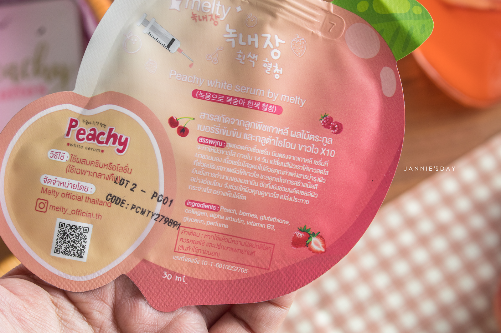ลักษณะเนื้อเซรั่ม :: มีสีส้มพีช เนื้อเซรั่มจะค่อนข้างเหลว มีกลิ่นหอมพีชมากจริงๆ