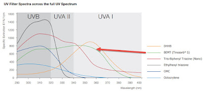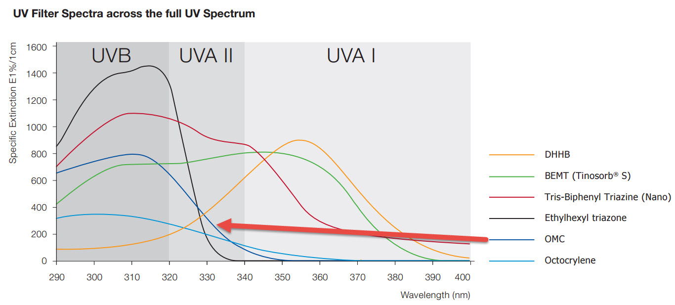 BEMT เป็นสารกันแดดเฉพาะ UVB ที่มีประสิทธิภาพสูง ครอบคลุม UVB/UVA I/II เมื่อเทียบค่า Specific Extinction E1%/1cm |