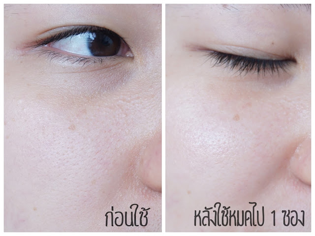 เรามาดูตั้งแต่ที่ใช้ครั้งแรก จนใช้หมดไป 1 ซองกันบ้าง อันนี้ใช้ได้ประมาณ 1 อาทิตย์กว่าๆ นะคะ พอมาดูจะเห็นว่ารูขุมขนดูเล็กลงมาจิ๊ดนึง ดูเบลอๆ ไม่ได้เห็นชัดอย่างตอนแรก ๆ พวกรอยดำต่าง ๆ ก็จางลงไปบ้าง หน้าไม่แห้งกร้าน ทาก่อนแต่งหน้ารู้สึกหน้าเด้ง เครื่องสำอางเกาะผิวดี ไม่เป็นคราบ แต่ที่ชอบที่สุดเลยคือ ทาแล้วหน้านิ่ม นุ่มๆ เด้งๆดีย์