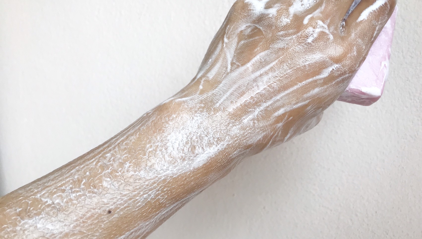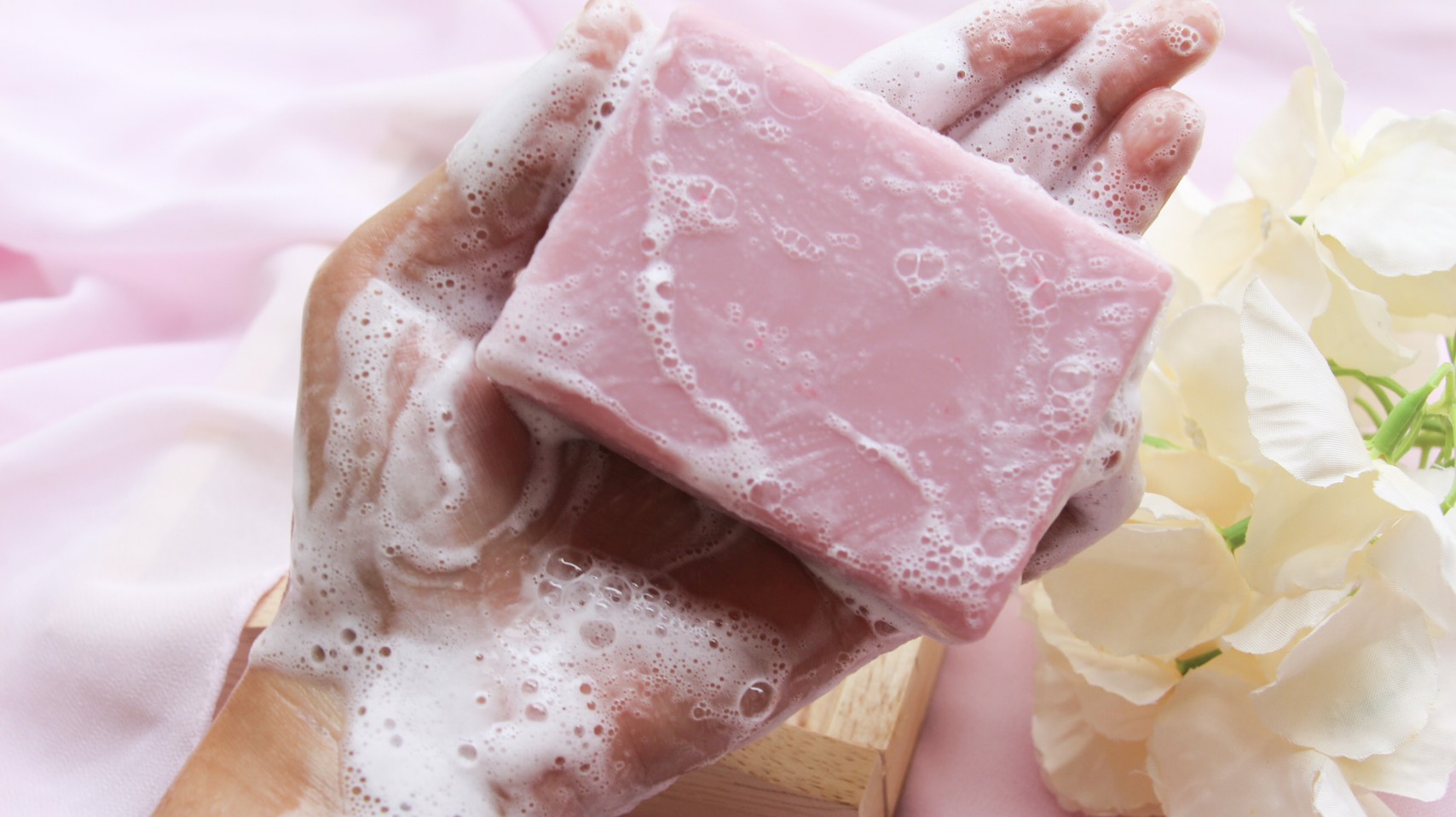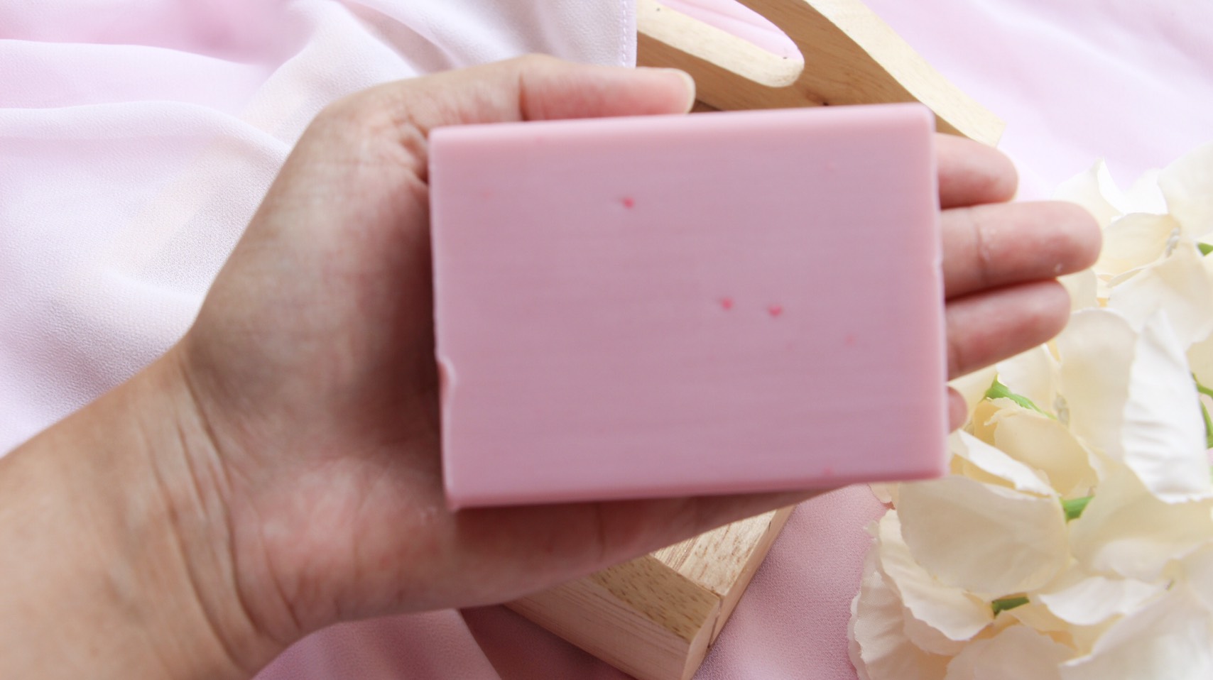 ก้อนสบู่เป็นสีชมพู และมีตัวสครับด้วย