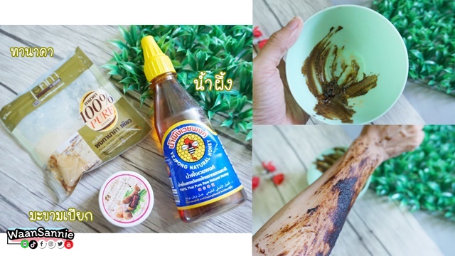 ผงทานาคา น้ำผึ้ง และมะขามเปียก หรือครีมมะขามพะเยาก็ได้ค่ะ นำมาผสมกัน