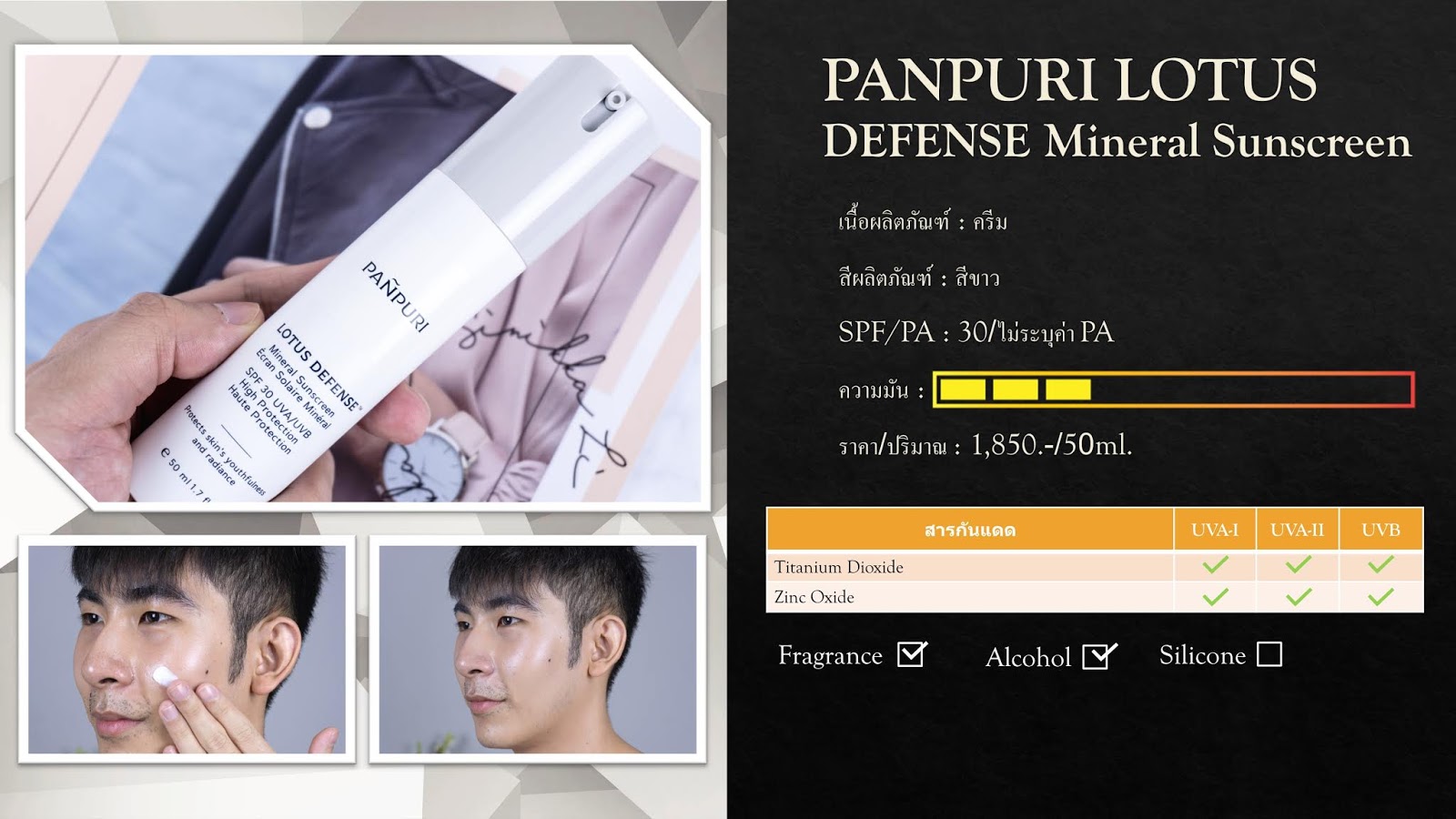 หากพูดถึงสกินแคร์แบรนด์ไทยที่ก้าวมาอยู่ในระดับสากล และมีความโดดเด่นในเรื่องส่วนผสมแล้วหละก็ PANPURI คือ ชื่อแรกที่เรานึกถึง ด้วยความใส่ใจในการเลือกส่วนผสม พยายามตัดส่วนผสมที่เป็นอัตรายต่อผิวออก และเลือกใช้สารสกัดที่เป็นออร์แกนิคที่ได้จากธรรมชาติให้ได้มากที่สุดอย่าง PANPURI LOTUS DEFENSE Mineral Sunscreen ขวดนี้ที่ใช้สารกันแดดแบบ Physical ล้วนที่ค่อนข้างปลอดภัยกับผิว
