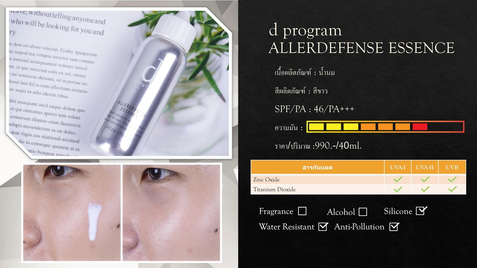 เมื่อพิจารณาถึงปัญหามลภาวะฝุ่น PM2.5 ที่ต้องเผชิญแล้ว d program ALLERDEFENSE ESSENCE SPF46 PA+++ ถือว่าเป็นกันแดดอีกหนึ่งแบรนด์ที่เราหยิบมาใช้ค่อนข้างบ่อยด้วยคุณสมบัติ Anti-Pollution ที่ดักจับอนุภาคเล็กๆ จากฝุ่นละอองได้ดี ช่วยลดโอกาสแพ้ระคายเคืองของเราไปได้เยอะเลยทีเดียวหละ ความน่าสนใจอีกอย่าง คือ สารกันแดดที่ใช้เป็นกลุ่ม Physical Sunscreen ล้วน ทำให้คนที่แพ้สารกันแดดกลุ่ม Chemical หัวใจพองโตได้ไม่ยาก