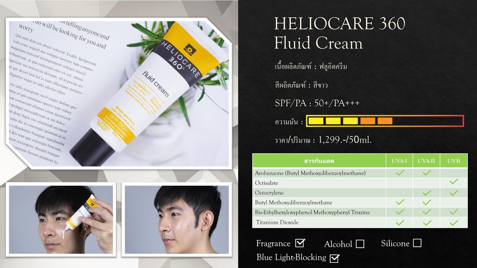 ถ้าวันที่เราต้องออกแดดนานๆ เจอแดดจัด HELIOCARE 360 Fluid Cream SPF50+ PA++++ จะเป็นกันแดดที่เรามักจะหยิบมาใช้บ่อยที่สุด ด้วยประสิทธิภาพของสารกันแดดที่จัดมาเต็มแม็กซ์ กันได้ครบทุกช่วงไม่ว่าจะเป็น UVA-I, UVA-II และ UVB และมีความเสถียรของสารกันแดดสูงทีเดียว ในด้าน Texture เนื้อ Fluid Cream ก็ไม่ได้หนักหน้าจนเกินไป สามารถใช้แทน Moisturizer ไปได้ในตัว แต่ระหว่างวันก็ยังแอบมีความมันพอสมควร (ซับออกก็หายเน้อ)