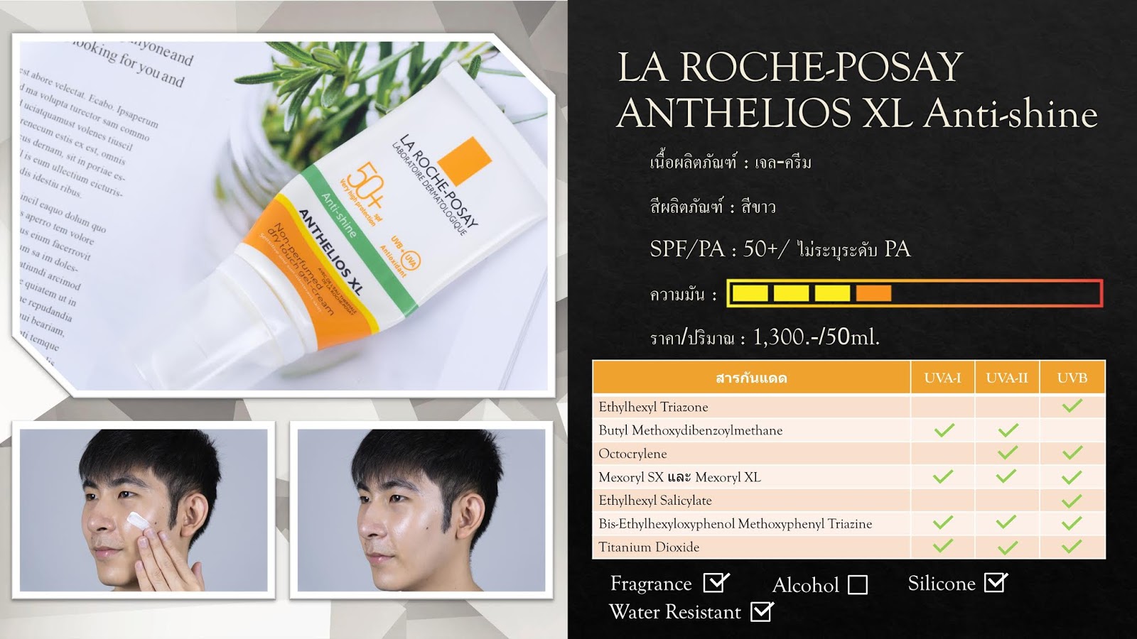 ส่วนในแง่ของประสิทธิภาพกันแดดขวดนี้ทำออกมาได้ดีทีเดียวแม้ว่าจะดูด้อยกว่ารุ่นพี่อย่าง ANTHELIOS XL Anti-shine ไปซักเล็กน้อย แต่สำหรับวันสบายๆ เราถือว่าเกินพอแล้วหละครับ อ๋อ! เห็น Texture เค้าเบาสบายผิวแบบนี้แต่เค้า Water Resistant นะเออ และก็ตามสไตล์กันแดดสมัยใหม่ที่มักจะใส่สาร Antioxidant เข้ามาเพื่อช่วยลดผลกระทบจาก Free Radical ที่เกิดจากรังสียูวีได้ในระดับนึงขอรับ