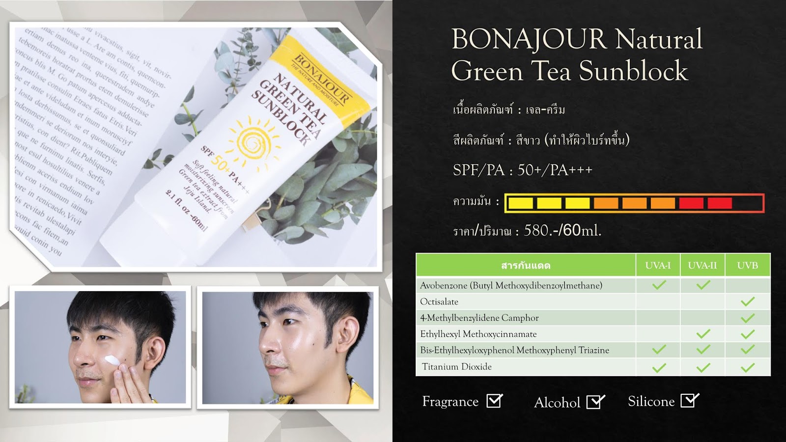 แต่ใช่ว่าจะมีข้อดีอย่างเดียว เพราะเมื่อลองทดสอบการกระจายตัวของความมันบนแผ่นฟิล์มซับมันพบว่ามีการกระจายตัวที่ค่อนข้างสูงทีเดียว แน่นอนว่าเมื่ออยู่บนผิวหน้าผนวกกับความมันบนผิวย่อมต้องมันขึ้นอย่างเห็นได้ชัด ดังนั้นเราคิดว่า BONAJOUR Natural Green Tea Sunblock น่าจะเหมาะกับมนุษย์ผิวค่อนข้างแห้ง และมีสีผิวที่ขาวในระดับนึงเลยหละครับ