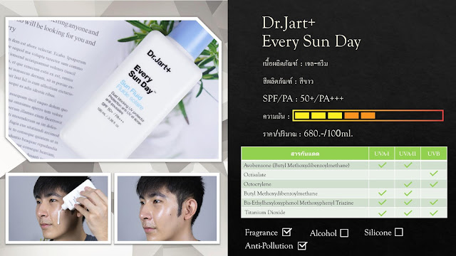 Dr.Jart+ เป็นอีกหนึ่งแบรนด์ที่มีผลิตภัณฑ์น่าสนใจค่อนข้างเยอะ แถมยังทำราคาออกมาได้น่ารักทีเดียว อย่าง Dr.Jart+ Every Sun Day SPF50+ PA+++ ขวดนี้ที่เรามองว่า ราคา/ปริมาณ ทำออกมาได้เด็ดดวงมากทีเดียวหละครับ แถมในแง่ของประสิทธิภาพกันแดดเมื่อพิจารณาจากสารกันแดดแล้วก็จัดว่าดีทีเดียวกันแดดได้ครบและค่อนข้างเสถียร