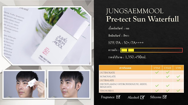 ด้วยเนื้อสัมผัส และส่วนผสมในการมอบความชุ่มชื้นของ JUNGSAEMMOOL PRE-TECT SUN Waterfull SPF50+ PA++++ ทำให้ผิวเราชุ่มชื้นขึ้นอย่างมาก ทำให้การลงเมคอัพต่อจากนี้ทำได้ง่ายขึ้น และได้ผิวที่ดูสวยกำลังดี ส่วนในแง่ของการปกป้องผิวจากแสงแดดก็ถือว่าทำได้ดีทีเดียว ทางแบรนด์เลือกใช้สารกันแดดที่มีประสิทธิภาพและค่อนข้างเสถียร