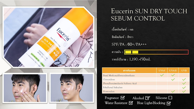 ที่น่าสนใจคือเค้ามีให้เลือกหลายสูตรมากไม่ว่าจะเป็นสูตรสำหรับผิวมัน, ผิว Sensitive, Whitening และ Age Repair โดยสูตรที่เราหยิบมาใช้ช่วงนี้คือ Eucerin SUN DRY TOUCH SEBUM CONTROL SPF60+ PA+++ ที่ใส่คาร์นีทีนช่วยควบคุมความมันระหว่างวัน ช่วยลดโอกาสเกิดสิวอุดตัน ได้อย่างมีประสิทธิภาพ สูตรนี้อาจจะหาซื้อยากนิดนึงเพราะเค้ามีจำหน่ายเฉพาะในโรงพยาบาลเท่านั้นขอรับ