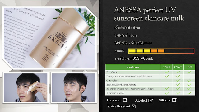 กันแดดในตำนานที่ไม่พูดถึงไม่ได้อย่าง ANESSA ขวดสีทองอันโด่งดัง หากวิเคราะห์ในแง่ของสารกันแดดที่ใส่มาส่วนตัวเราคิดว่าค่อนข้างครบ สามารถกันรังสี UVA และ UVB ได้ดีทีเดียว แถมล่าสุดยังได้มีการปรับสูตรใหม่เพิ่มเทคโนโลยี Aqua Booster EX ที่ทำให้ยิ่งโดนน้ำหรือเหงื่อก็ยิ่งเพิ่มประสิทธิภาพการกันแดดให้มีประสิทธิภาพมากขึ้น