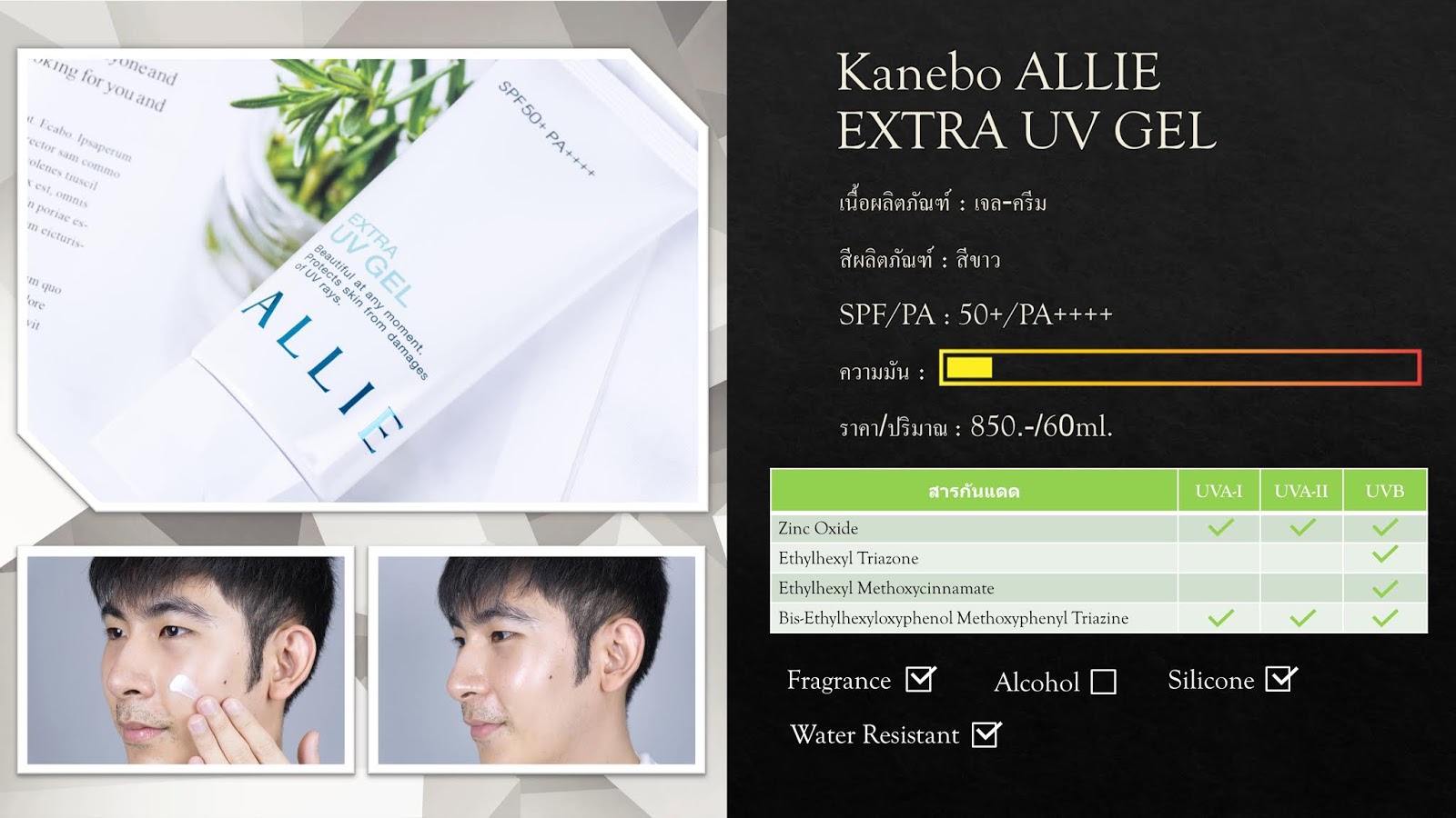 นอกจากนี้กันแดดขวดนี้ยังแหวกแนวจากกันแดดสัญชาติญี่ปุ่นเพราะไม่ใส่น้ำหอม และแอลกอฮอล์เข้ามาในสูตร ซึ่งถือว่าน่าสนใจทีเดียว แถมยังมีคุณสมบัติ Water Resistant พ่วงเข้ามาด้วยหละ แต่น่าเสียดายตรงที่ผลทดสอบความมันของกันแดดขวดนี้ทำออกมาได้ไม่ดีนักขอรับ