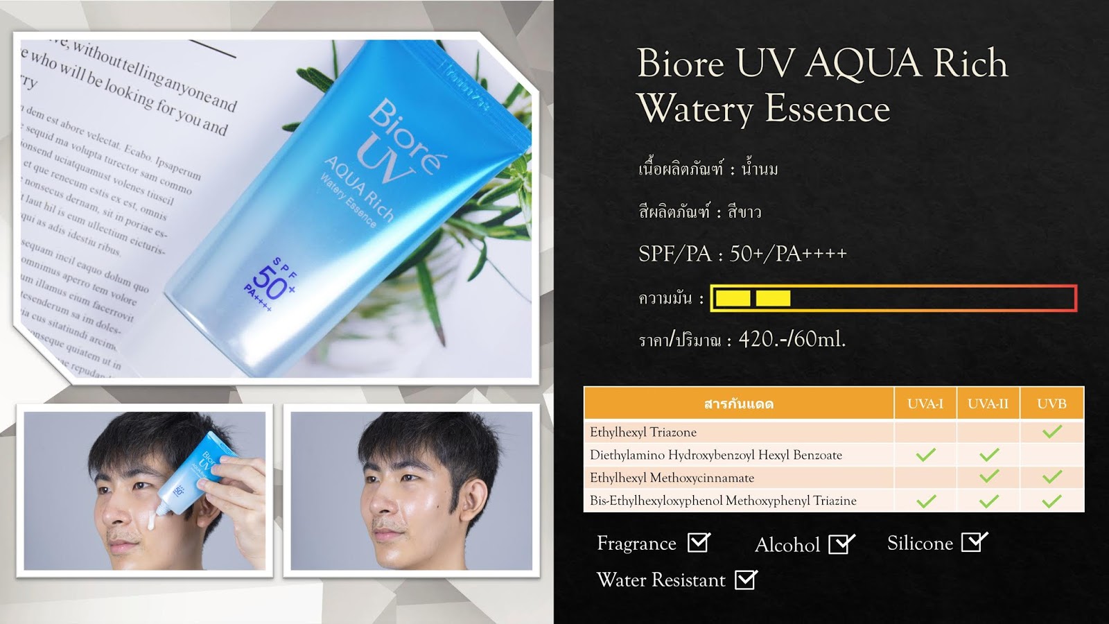 หากย้อนกลับไปเมื่อสมัยเรายังเรียนมหาลัย Biore UV AQUA Rich Watery Essence เป็นกันแดดที่เราใช้บ่อยมาก ด้วยความที่เนื้อสัมผัสบางเบา ซึมไว แถมราคายังสบายกระเป๋าเลย สารกันแดดที่ใส่มาอยู่ในระดับปานกลางพอไปวันไปวาได้ ซึ่งเราแนะนำให้ทาซ้ำทุกๆ 2-4 ชม. อีกจุดคือสารกันแดดทั้งหมดเป็นแบบ Chemical Sunscreen ซึ่งในบางคนที่แพ้สารกัดแดดกลุ่มนี้ก็อาจจะไม่ถูกกับน้องคนนี้เท่าไหร่นัก