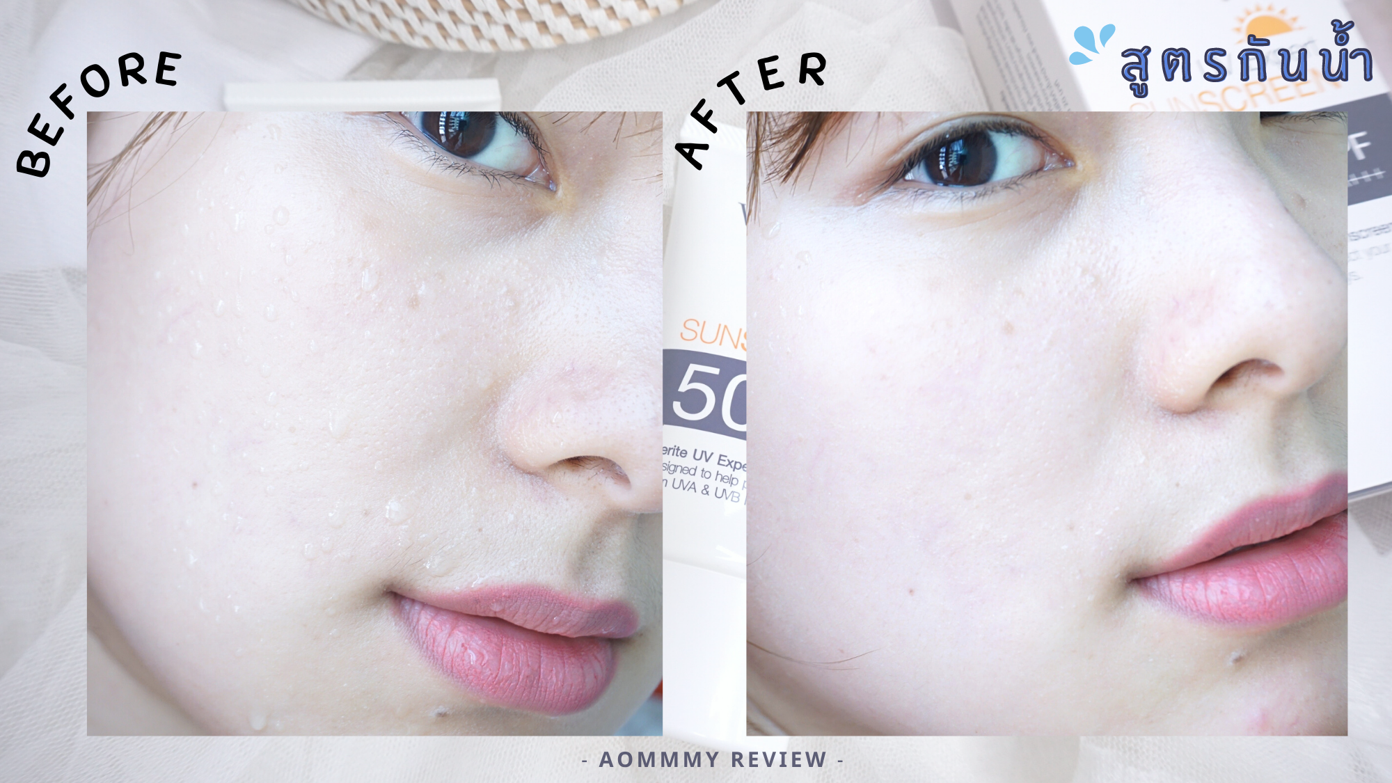 ตัวนี้เป็น สูตรกันน้ำ นะ ซึ่งออมก็ลองฉีดน้ำลงบนผิว แล้วซับออก ก็ไม่มีรองรอยความเป็นคราบของครีมเลย