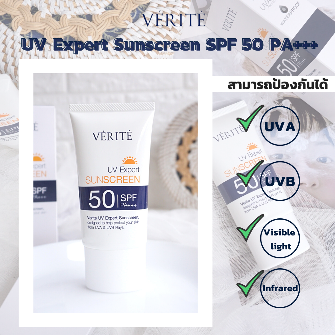 ครีมกันแดด Verite UV Expert Sunscreen SPF50 PA นี้นั้น สามารถปกป้องผิวของเรา จากรังสีทั้ง UVB และ UVAได้อย่างยาวนาน แล้ว ยังสามารถปกป้องผิวจาก Visible light และ Infrared ได้ด้วยค่า SPF 50 PA เรียกได้ว่ามีประสิทธิภาพสูงเลยทีเดียว และสามารถกันน้ำ ช่วยควบคุมความมันบนใบหน้า ระหว่างวันได้ด้วย