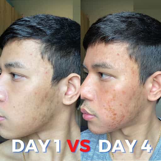 ไม่พูดพร่ำทำเพลง เห็นอะไรไหมทุกคน นี่คือวันที่1และวันที่4หลังจากผมใช้ cosmelan 2 มันคือหน้าที่กำลังถูกถอนรากถอนโคน แบบไม่บันยะบันยังเลยครับ ตอนแรกผมตกใจนะ แอบกังวลเหมือนกัน ว่ามันจะหนักกว่านี้อีกไหม แต่ด้วยความที่รู้แต่แรกอยู่แล้วว่าหน้าต้องถูกผลัดเซลส์ผิว เลยพอทำใจได้กับสิ่งที่เจอ เอาล่ะ หลังจากนี้ต้องใช้ความอดทนขั้นสุดกันละนะทุดคน มาลุ้นกับผมกันครับ