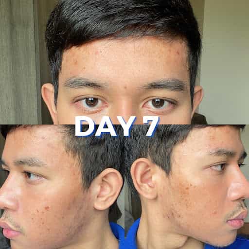 วันที่ 7 ของผม หน้าเริ่มดีขึ้นแล้วครับ ผิวที่ส้มๆแดงๆจากการหลุดลอกของชั้นผิวเริ่มเกลี้ยงขึ้นมาหน่อยแล้ว แต่ก็ยังมีส่วนกรอบหน้าที่รอยดำมันหนักหนาจริงๆ คงต้องให้เวลามันทำงานหน่อย