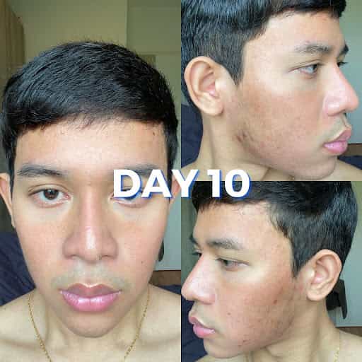 วันที่ 10 ของผม ยังมีการลอกอยู่ ช่วงจมูกกับแถวกรอบหน้า ลอกเป็นขุยขาวๆ มียุบยิบเล็กน้อยแต่ทนไหว ช่วงหน้าผากจะดูเห็นผลไวกว่าส่วนอื่นๆ