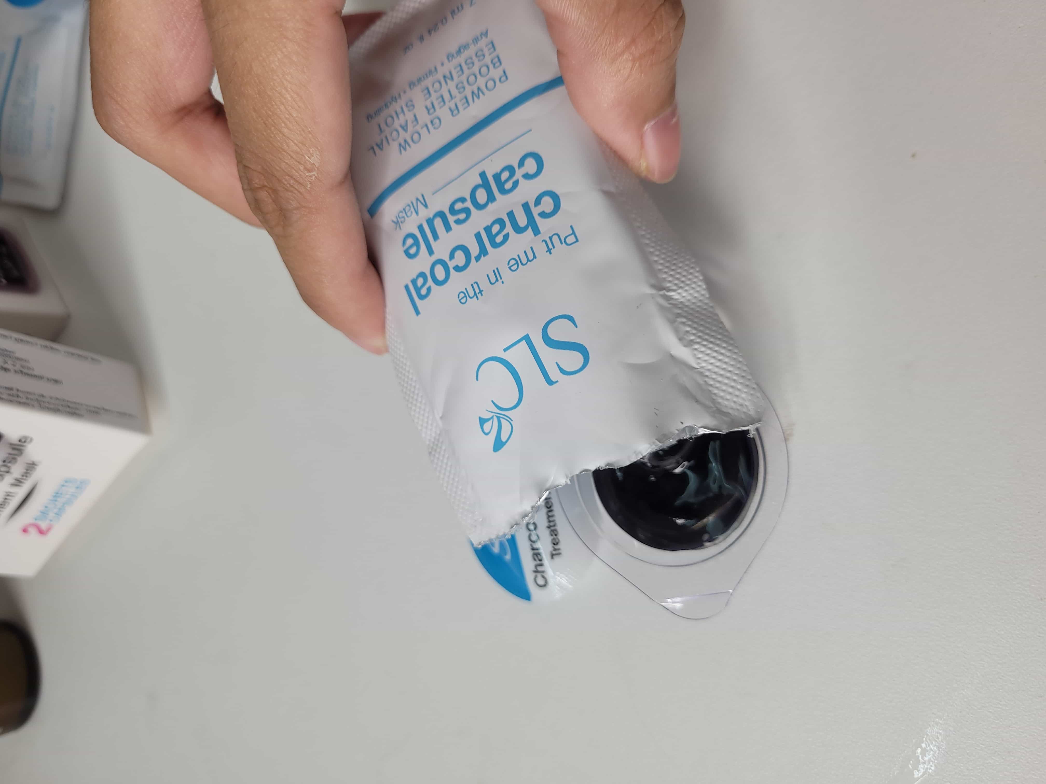 เมื่อทาเซรั่มเสร็จแล้ว สามารถใช้คู่กับตัว Charcoal Capsule Mask ตัวนี้ได้ โดยเทเซรั่มซองที่ให้คู่มาใส่ใน Charcoal Capsule Mask จากนั้นตัว Mask จะพองตัวออก จนสามารถคลี่ออกมาเป็นแผ่นมาร์กหน้าได้