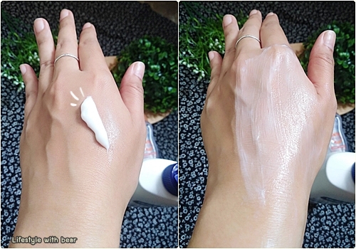 เนื้อครีมเค้าจะเป็นเนื้อโลชั่นสีขาว มีความเข้มข้นแต่ไม่เหนียวเหนอะหนะ ทาลงผิวแล้วรู้สึกเลยว่าผิวนุ่มชุ่มชื้นทันที ยิ่งใช้ติดกันครบ 5 วันตามที่เค้าบอกผิวยิ่งนุ่มขึ้นไปอีก อ้อ! รุ่นนี้เค้าไม่ผสมน้ำหอมด้วยนะ คนที่แพ้น้ำหอมก็สามารถใช้ได้จ้า
