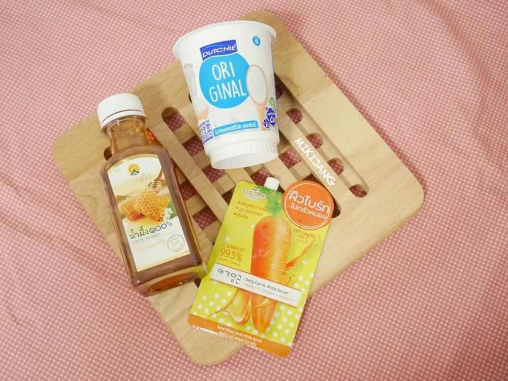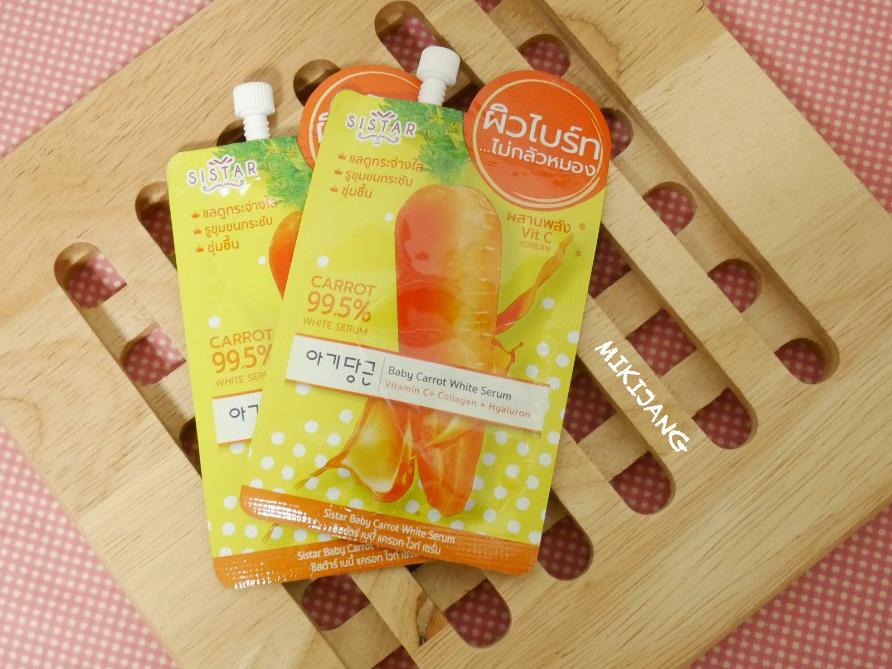 บอกไปตอนแรกว่ามีวิตามินซีเป็นส่วนผสมหลัก หลายคนคงคิดว่าเราจะใช้พวกมะนาวหรือเปล่า? เปล่าจ้ะ ขอใช้อะไรที่ง่ายกว่านั้น เราใช้เซรั่มแครอทของ SISTAR ค่ะ ได้มาจากเซเว่นซองละ 39 บาท เป็นเซรั่มซองที่คือเลิฟมาก เพราะใช้แล้วไม่แพ้ กลิ่นหอมละมุน ๆ ใช้แล้วผิวใสขึ้น รอยสิวจางลง (ลืมบอกไปว่ามีสิวเป็นไม้เบื่อไม้เมาจ้ะ) เลยต้องซื้อเจ้าตัวนี้ตุนเอาไว้เลย