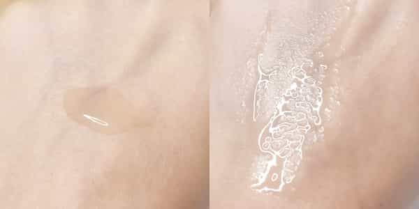เนื้อกันแดดเป็นแบบน้ำ สีขาว ไม่มีกลิ่น ทาง่าย เกลี่ยง่าย ซึมลงผิวได้ดี ใช้แล้วไม่เป็นคราบ