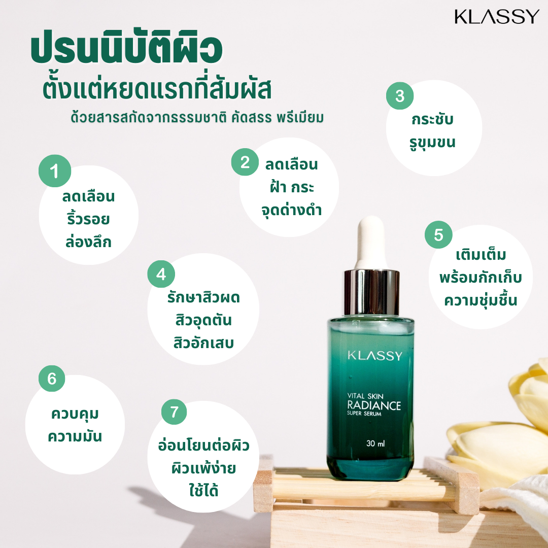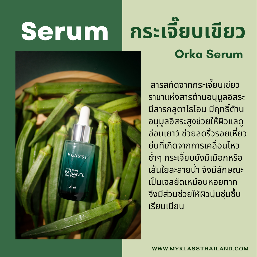 ดังนั้นสารสกัดจากกระเจี๊ยบเขียวที่อยู่ในเซรั่มจึงมีส่วนช่วยในการปรนนิบัติผิวได้อย่างดีเยี่ยม วันนี้เรามีเซรั่มน้องใหม่ KLASSY SUPER SERUM เซรั่มกระเจี๊ยบเขียว มีคุณสมบัติในการเติมความชุ่มชื้นให้กับผิว ให้ผิวนุ่มชุ่มชื้นยาวนาน กระชับรูขุมขน ช่วนลดเลือนริ้วรอย ลดการอักเสบของผิว ทำให้หน้าสว่างกระจ่างใส ฉ่ำวาว เรียบเนียน ผิวสม่ำเสมอ