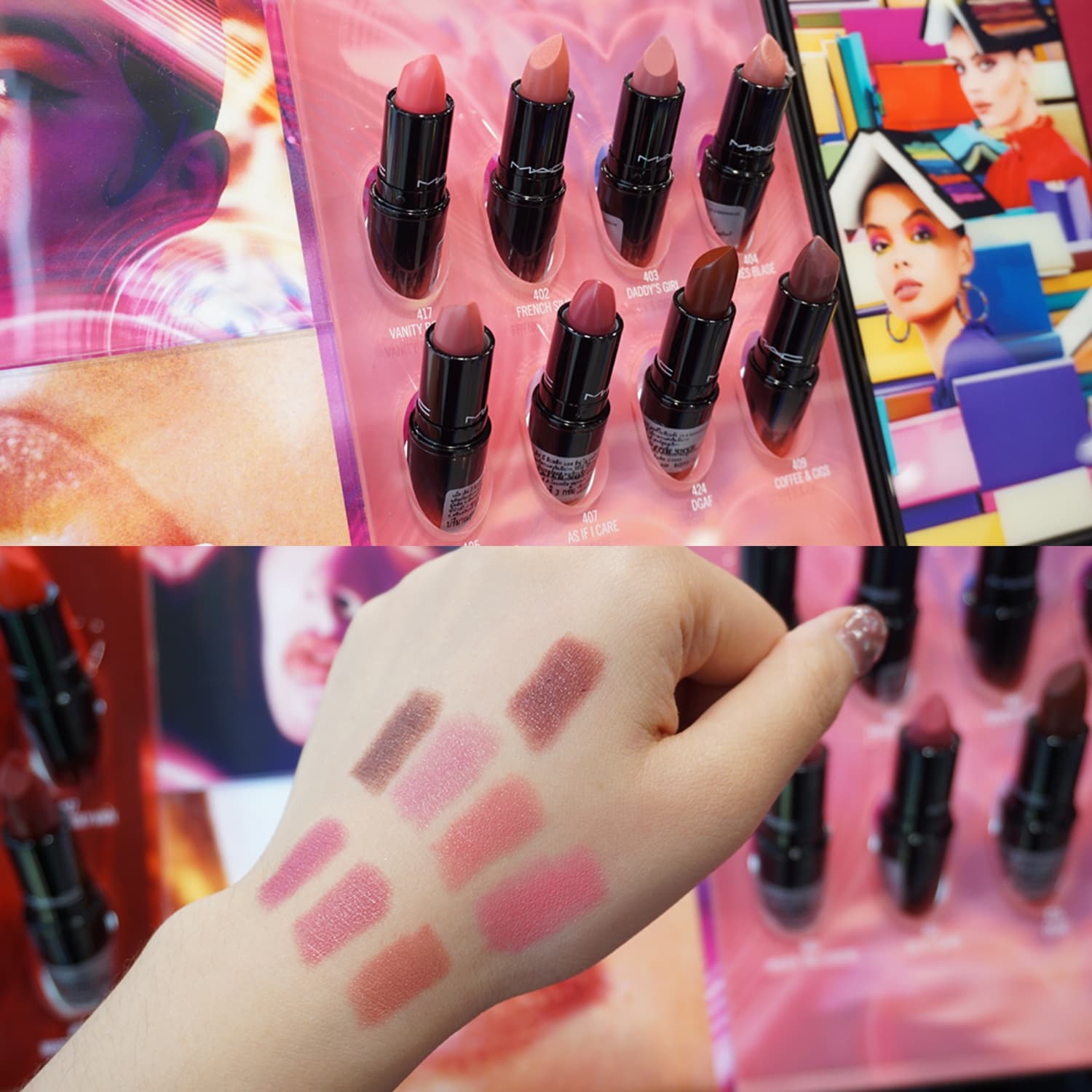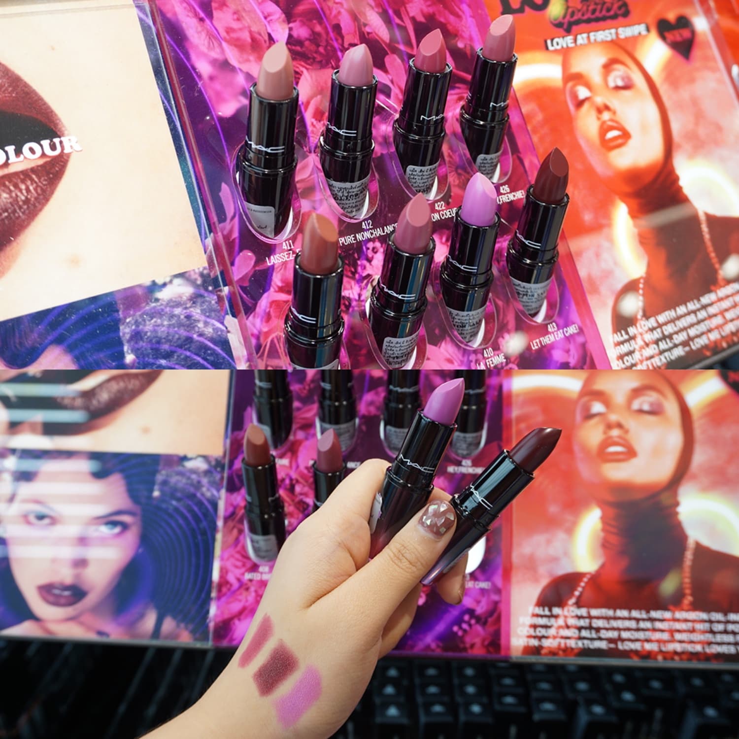 มาต่อกันที่ MAC แบรนด์ที่สาวๆ หลายคนชื่นชอบกันบ้างค่ะ ซึ่งส่วนนี้ก็ไม่ทำให้ผิดหวังเลยจริงๆ เพราะมีทั้งเคาน์เตอร์ให้ลองนั่งเทสโปรดักส์ นั่งแต่งหน้า ให้รู้กันไปเลย และยังมีลิปสติกให้เลือกหลายรุ่น หลายเฉดสีด้วย ออมเลยลองส่องมาให้เพื่อนๆ ได้ดูเป็นตัวอย่างกัน
