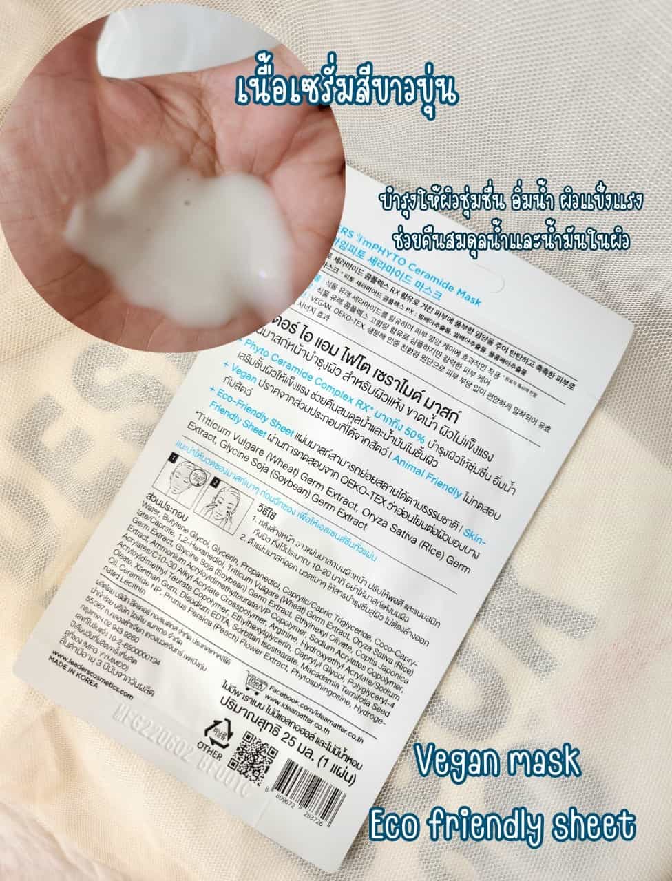 ต้องมาจากข้าวและสารสกัดจากธรรมชาติ โดยน้อนเขายังมี Phyto Ceramide Complex RX* มากถึง 50% หลักๆช่วยบำรุงผิวให้ชุ่มชื่น อิ่มน้ำ เสริมชั้นผิวให้แข็งแรง ช่วยคืนสมดุลน้ำและน้ำมันในชั้นผิว เนื้อเซรั่ม หรือเนื้อมาสก์ เป็นสีขาวขุ่นแบบนี้ กลิ่นหอมอ่อนๆ ที่สำคัญคือ น้อนเขาเป็น Vegan ด้วยนะคะ และไม่ผ่านการทดลองกับสัตว์ แถมแผ่นมาสก์ยังย่อยสลายได้ง่ายตามธรรมชาติอีกด้วย
