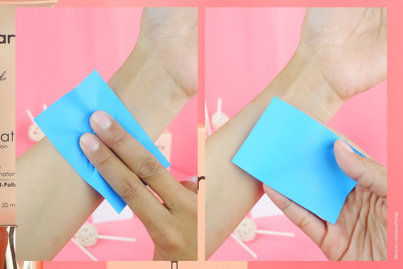 ตัวรองพื้นพอทาลงบนผิวปุ๊บ ก็เซ็ทตัวเป็นแป้งทันทีใน 1 นาที โดยที่ไม่ทิ้งความมันไว้บนผิวเลยแม้แต่น้อย พลอยลองเอากระดาษซับมันซับดูก็ไม่มีความมันติดออกมาเลย มันโอเคเลยเน้อ!