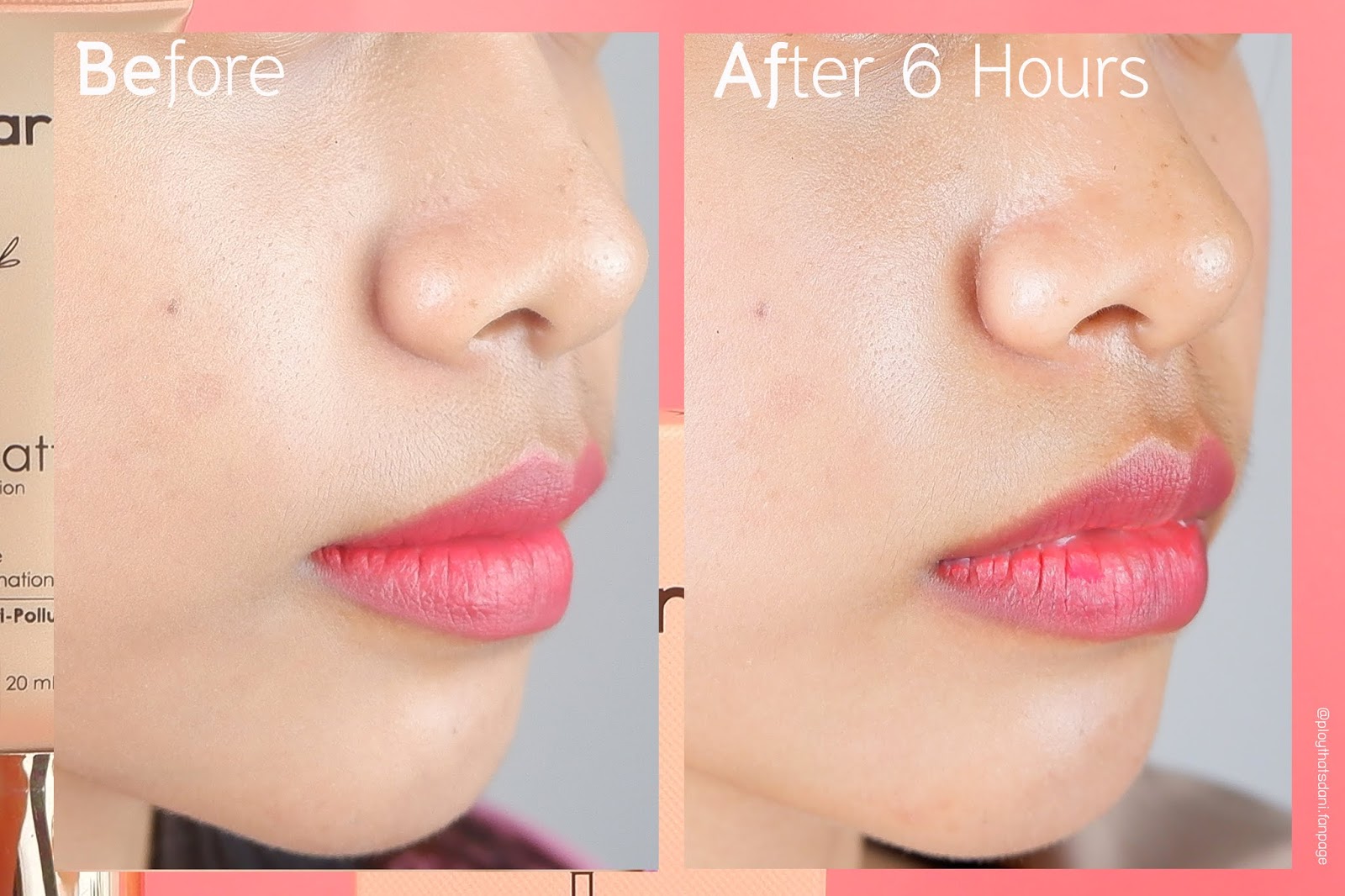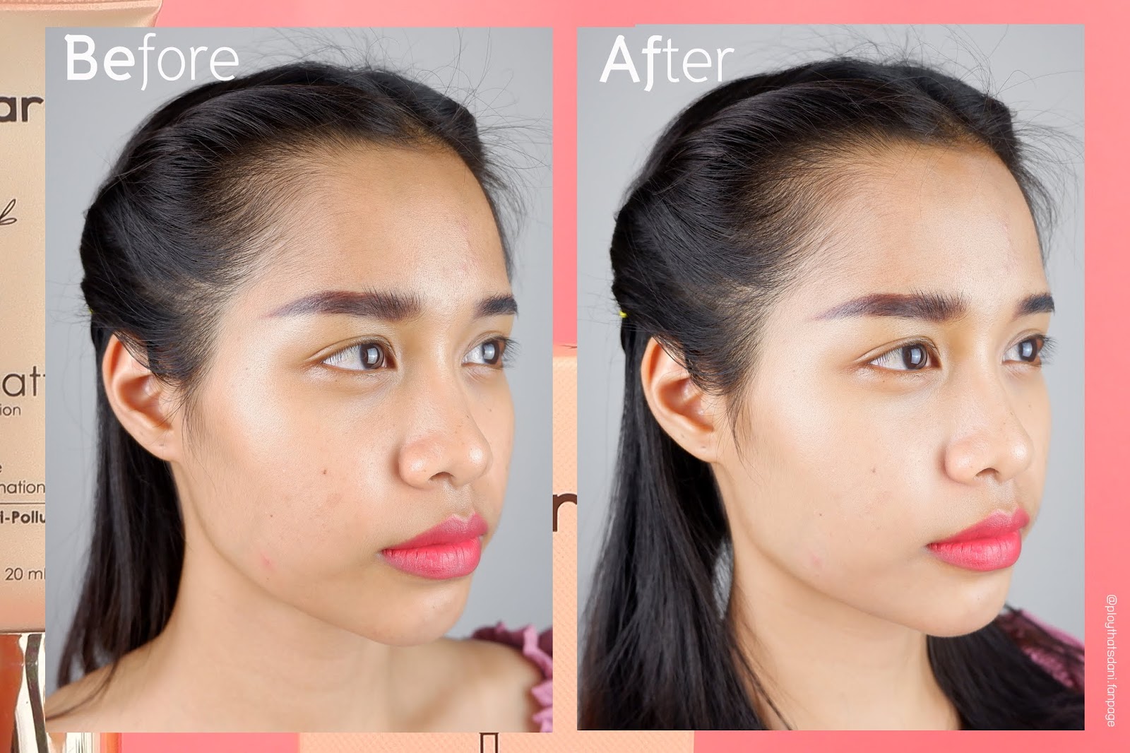 เปรียบเทียบแบบครึ่งหน้าให้ชมค่ะ จากผิวที่มันช่วงหน้าผาก จมูก คาง พอทารองพื้นลง...ผิวหน้าก็ดูแมทท์ทันที ตอนแรกก็แอบกังวลว่าจะวอกไหมนะ?? เพราะเลือกเฉดสีขาวสุดมา แต่ก็ไม่ผิดหวังเลยค่า เพราะรองพื้นไม่ได้ขาวไปกว่าผิวจริงเท่าไหร่เลย และยังทำให้ผิวดูสว่างตามที่ต้องการจริงๆเน้อ (ตอนแรกพลอยผิวขาวกว่านี้ค่ะ แต่เพราะตากแดดตอนไปเที่ยวมาเลเกือบทุกวัน แล้วไม่ได้ทากันแดดซ้ำก็เลยหมองค่า)