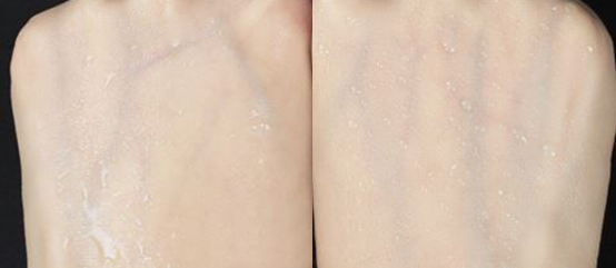 จะเห็นได้ว่าข้างซ้ายก่อนใช้สเปรย์กันแดดนั้นผิวจะเปียกน้ำปกติ แต่ข้างขวาหลังใช้นั้นผิวจะโดนเคลือบไว้จากกันแดดเพื่อปกป้องผิวเราจากรังสี UVB และ UVA ล็อกความชุ่มชื่น บำรุงผิว ทำให้น้ำที่โดนบนผิวเป็นเม็ดๆ เหมือนน้ำกลิ้งบนใบบัวค่ะ