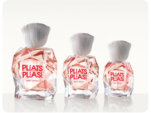 เหลี่ยมมุมอันชัดเจนอยู่บนผิวขวดแก้วในรูปแบบของลูกเล่นระหว่างแอ่งลึกกับสันนูน หน้าตัดหลากมิติของรูปทรงหลายเหลี่ยมแบบ PLEATS PLEASE พลันมีชีวิตเมื่อต้องแสงสว่าง ก่อให้เกิดประกายสะท้อนออกมาเป็นระลอกรัศมีต่อเนื่องไม่รู้จบ ไม่มีการใช้สีสดสว่าง หากเป็นประกายแสงซึ่งโดดเด่น มีชีวิตชีวาอย่างลุ่มลึกด้วยน้ำหอมเจือสีชมพูอ่อนภายใน