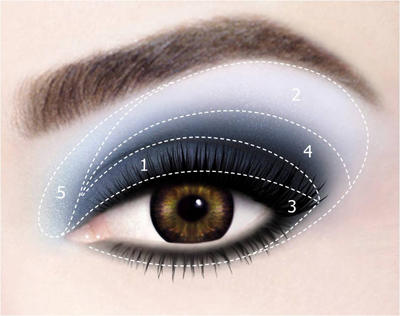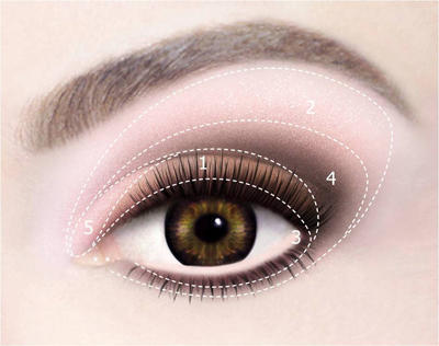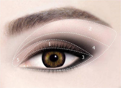 - รอยพับหรือชั้นตา ซึ่งอยู่ระหว่างโหนกคิ้วกับเปลือกตา ดูกว้างขึ้นและยาวขึ้น ด้วยการใช้สีกลาง (4) แรเงาที่หางตา ใช้พู่กันเกลี่ยสีขึ้นไปยังโหนกคิ้ว การเกลี่ยเบาๆ นี้ช่วยให้คุณผสมสีเข้มกับสีบนโหนกคิ้วและเปลือกตา ซึ่งช่วยให้รูปตาดูยาวขึ้น