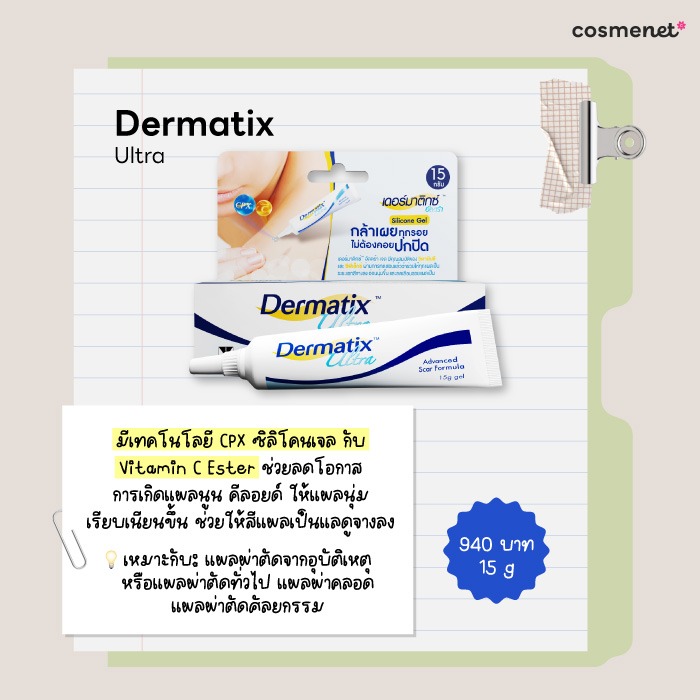 ใครที่กำลังมองหาเจลที่ช่วยดูแลรอยแผลเป็นอยู่ล่ะก็ จะไม่มีแบรนด์ Dermatix Ultra ติดอยู่ในลิสต์ได้ยังไง เพราะเป็นเจลลดรอยแผลเป็นยอดฮิตที่คุณแม่หลายคนแนะนำหลังการผ่าคลอด เป็นซิลิโคนเจลลดเลือนรอยแผลเป็นที่มีส่วนผสมของ CPX ที่ช่วยให้แผลเป็นอ่อนนุ่มและดูเรียบเนียนขึ้น ควบคู่กับ Vitamin C Ester ที่ช่วยให้แผลเป็นแลดูจางลงและมีสีผิวที่สม่ำเสมอขึ้นเมื่อใช้อย่างต่อเนื่อง