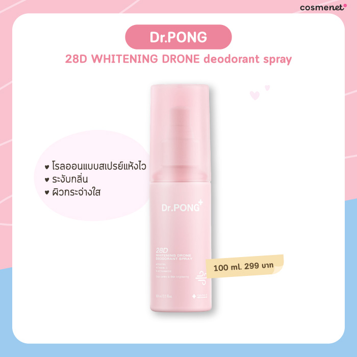 ปิดท้ายลิสต์โรลออนผู้หญิงยี่ห้อไหนดีไปกับ Dr. PONG แบรนด์มาแรงที่มีไอเทมเด็ดใช้ดีเต็มไปหมด โรลออนของเค้าก็ใช้ดีไม่แพ้กัน มาในรูปแบบสเปรย์ระงับกลิ่นกายลดกลิ่นตัว ลดเลือนความหมองคล้ำด้วย Niacinamide และ Dr.PONG 28D whitening drone และ AHA ไม่มีน้ำหอม และยังสามารถใช้ได้ทั้งชายและหญิงเลย