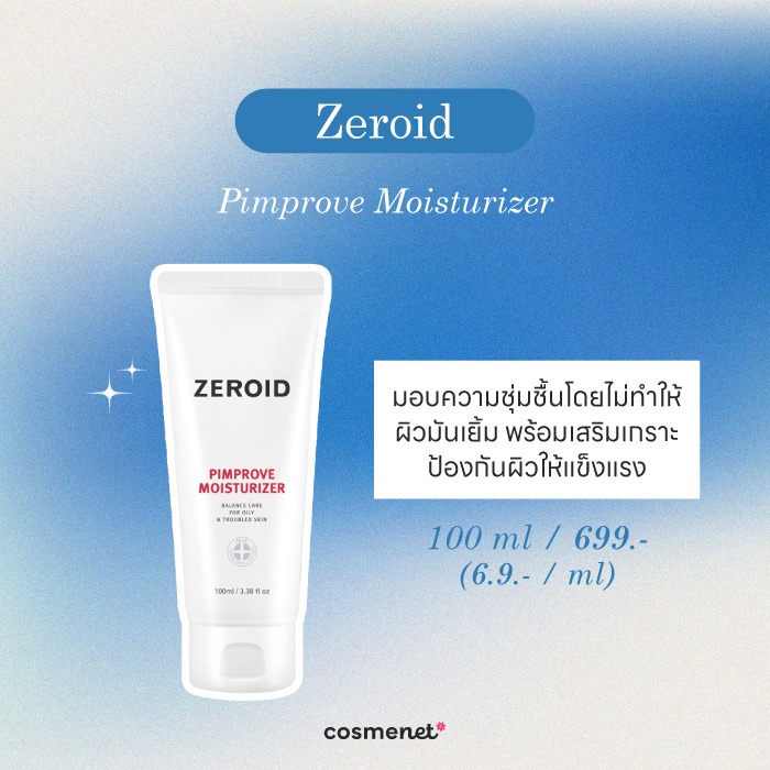 | Zeroid Pimprove Moisturizer | มอบความชุ่มชื้นโดยไม่ทำให้ผิวมันเยิ้ม พร้อมเสริมเกราะป้องกันผิวให้แข็งแรง | ผิวมัน, ผิวผสม, ผิวเป็นสิว | MLE® (Multi-Lamellar Emulsion) + Ceramide-9S: เทคโนโลยีที่เลียนแบบโครงสร้างไขมันผิวธรรมชาติ เสริมเกราะป้องกันผิวให้แข็งแรง ป้องกันการสูญเสียน้ำ | 1,199.- | 100 ml. | ShopeeLazada | |
