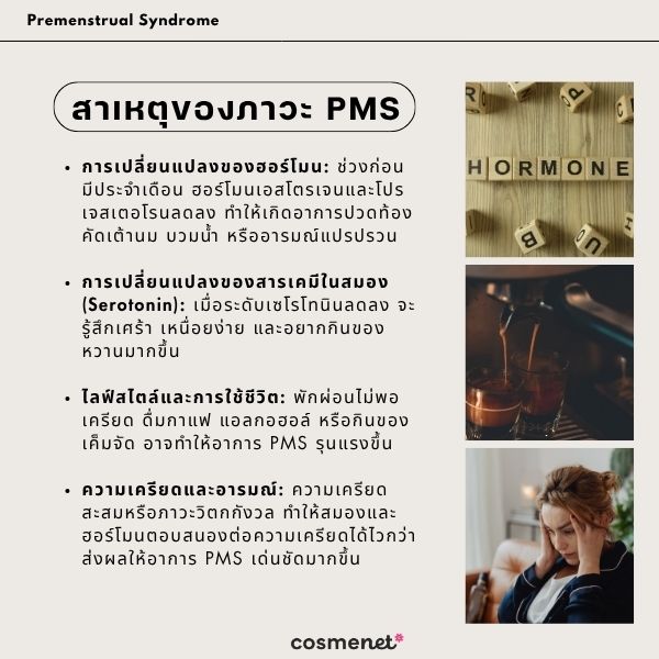 - การเปลี่ยนแปลงของฮอร์โมน : ในช่วงก่อนมีประจำเดือน ฮอร์โมนเอสโตรเจนและโปรเจสเตอโรนจะลดลงอย่างรวดเร็ว ทำให้เกิดอาการทางกาย เช่น ปวดท้อง คัดเต้านม หรือบวมน้ำ รวมถึงอาการทางอารมณ์อย่างหงุดหงิดและอ่อนไหวง่าย