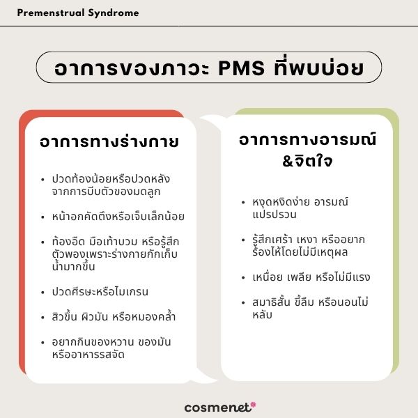 อาการของภาวะ PMS (Premenstrual Syndrome) มักเกิดขึ้นในช่วง 5 - 10 วันก่อนมีประจำเดือน และจะค่อย ๆ บรรเทาเมื่อรอบเดือนเริ่มมา โดยสามารถแบ่งได้เป็น 2 กลุ่มหลักคือ อาการทางร่างกาย และ อาการทางอารมณ์