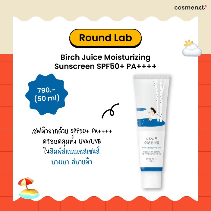 แน่นอนว่าพลาดไม่ได้กับ Round Lab Birch Juice Moisturizing Sunscreen กันแดดตัวฮิตที่ช่วยเซฟผิวจากแสงแดดด้วย SPF50+ PA++++ ครอบคลุมครบทั้ง UVA/UVB แถมยังใส่สารบำรุงผิวมาอีกแบบแน่น ๆ ไม่ว่าจะเป็น Birch Juice และ Hyaluronic Acid ที่มาช่วยเติมความชุ่มชื้นให้ผิวนุ่มฟู และปลอบประโลมผิวหลังโดนแดดให้ผิวสงบขึ้น ไม่แดงง่าย ซึ่งทั้งหมดนี้มาในสัมผัสแบบเอสเซนส์เนื้อบางเบา กระจายตัวได้ดี และซึมไวแบบไม่ทิ้งคราบ ทำให้ทาแล้วรู้สึกสบายผิว เหมือนผิวได้ทั้งเกราะปกป้องและความชุ่มชื้นในเวลาเดียวกัน คือเลิฟมาก